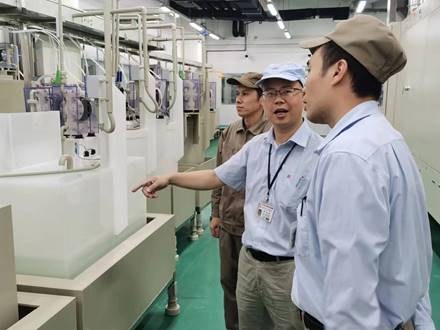 (袁歡欣同志與相關技術人員生産現場讨論藥水參數管控)