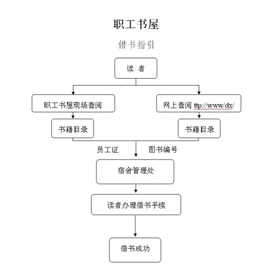 公司員工憑本人《員工卡》到宿舍二樓管理處辦理借書手續,需借閱的書籍可通過(guò)《職工書屋書籍目錄表》查找圖書編号。