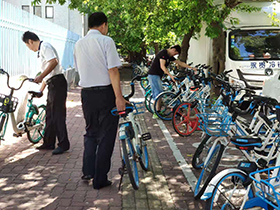 志願者將(jiāng)落葉等落地垃圾清理幹淨 志願者將(jiāng)馬路上的共享單車擺放整齊